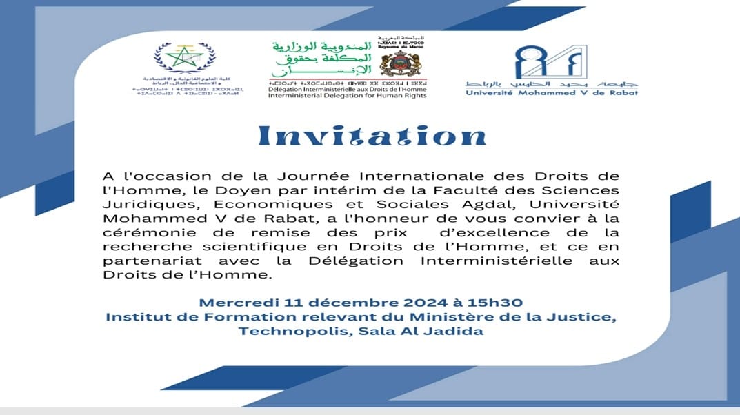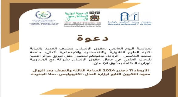 دعوة لحضور حفل توزيع جوائز التميز للبحث العلمي في مجال حقوق الإنسان بشراكة مع المندوبية الوزارية المكلفة بحقوق الإنسان dim, 12/08/2024 - 11:38 / 0 Comments
