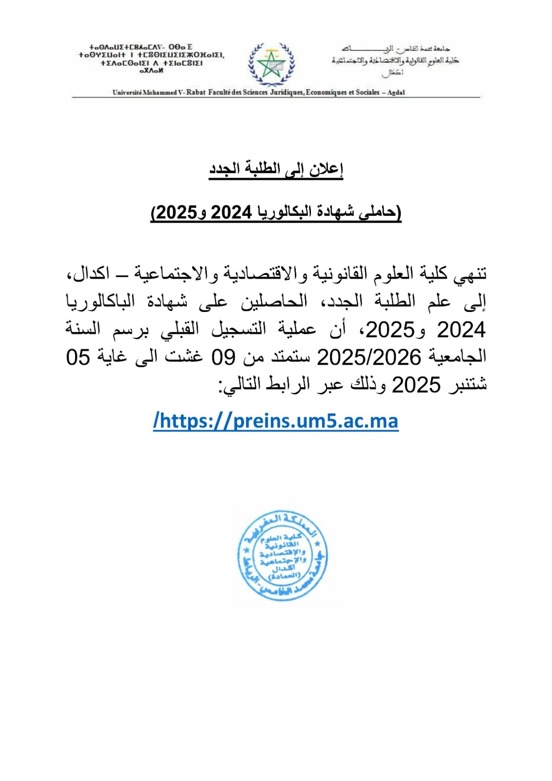 إعلان إلى الطلبة الجدد حاملي شهادة البكالوريا (2024 و2025)