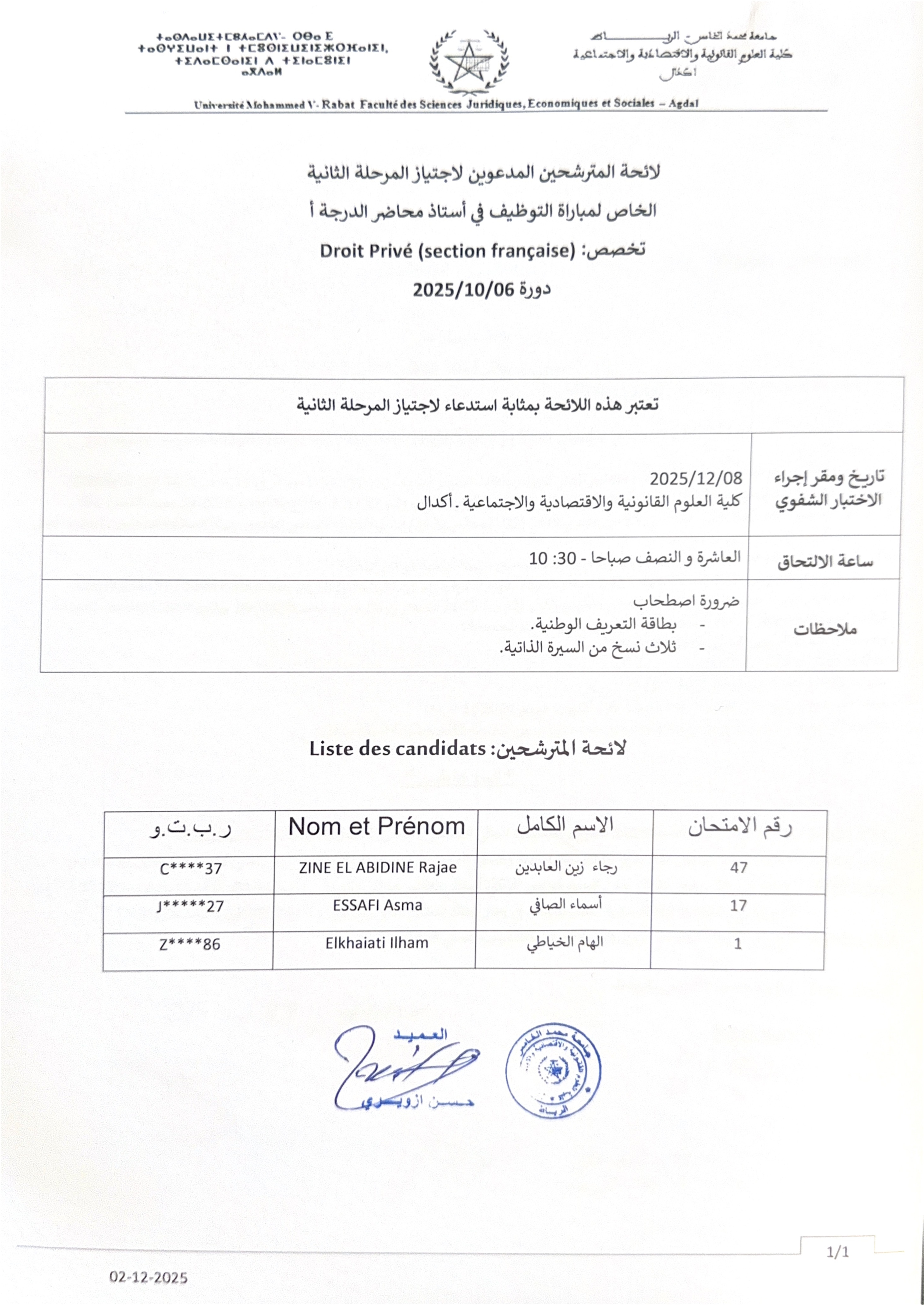 لائحة المترشحين المدعوين لاجتياز المرحلة الثانية الخاص لمباراة التوظيف في أستاذ محاضر الدرجة أ تخصص (section français) Droit privé دورة 2025/10/06 mer, 12/03/2025 - 11:31 / 0 Comments