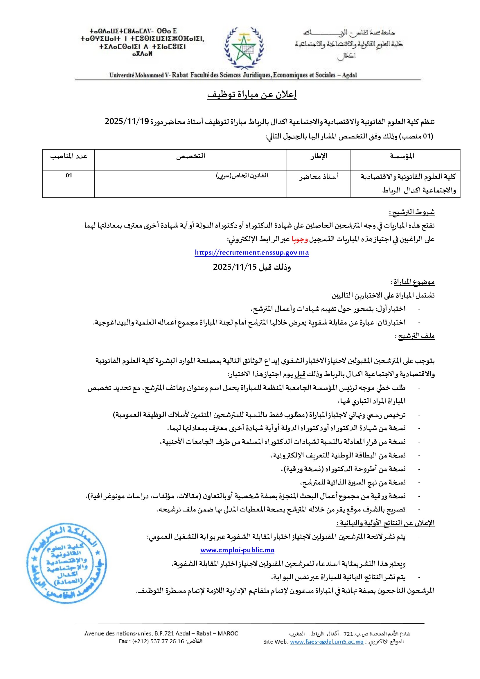 مباراة لتوظيف أستاذ محاضر (منصب 1) دورة 2025/11/19